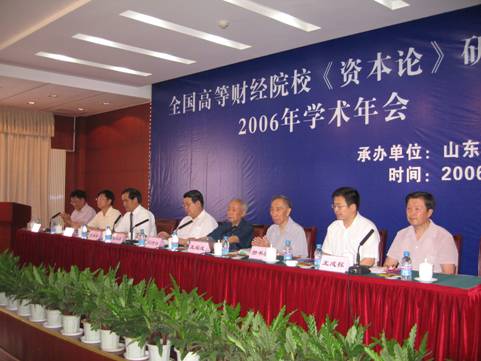 7月29日至8月2日,2006年全国高等财经类院校《资本论》研究会在我校国际交流中心召开。本次年会的主题为坚持马克思主义经济理论的指导地位,深入学习研究我国“十一五”规划纲要的重大理论和现实问题,坚定不移地深化改革、扩大开放。著名经济学家、全国高等财经院校《资本论》研究会会长刘诗白教授等国内知名专家和来自全国各财经院校的学者60余人参加了会议。山东经济学院党委书记张体勤教授和院长郝书辰教授参加了会议,并在主席台上就座,张书记代表我校致辞,并介绍了我校的基本情况。山东省社联副主席包心鉴研究员到会祝贺并讲话。
